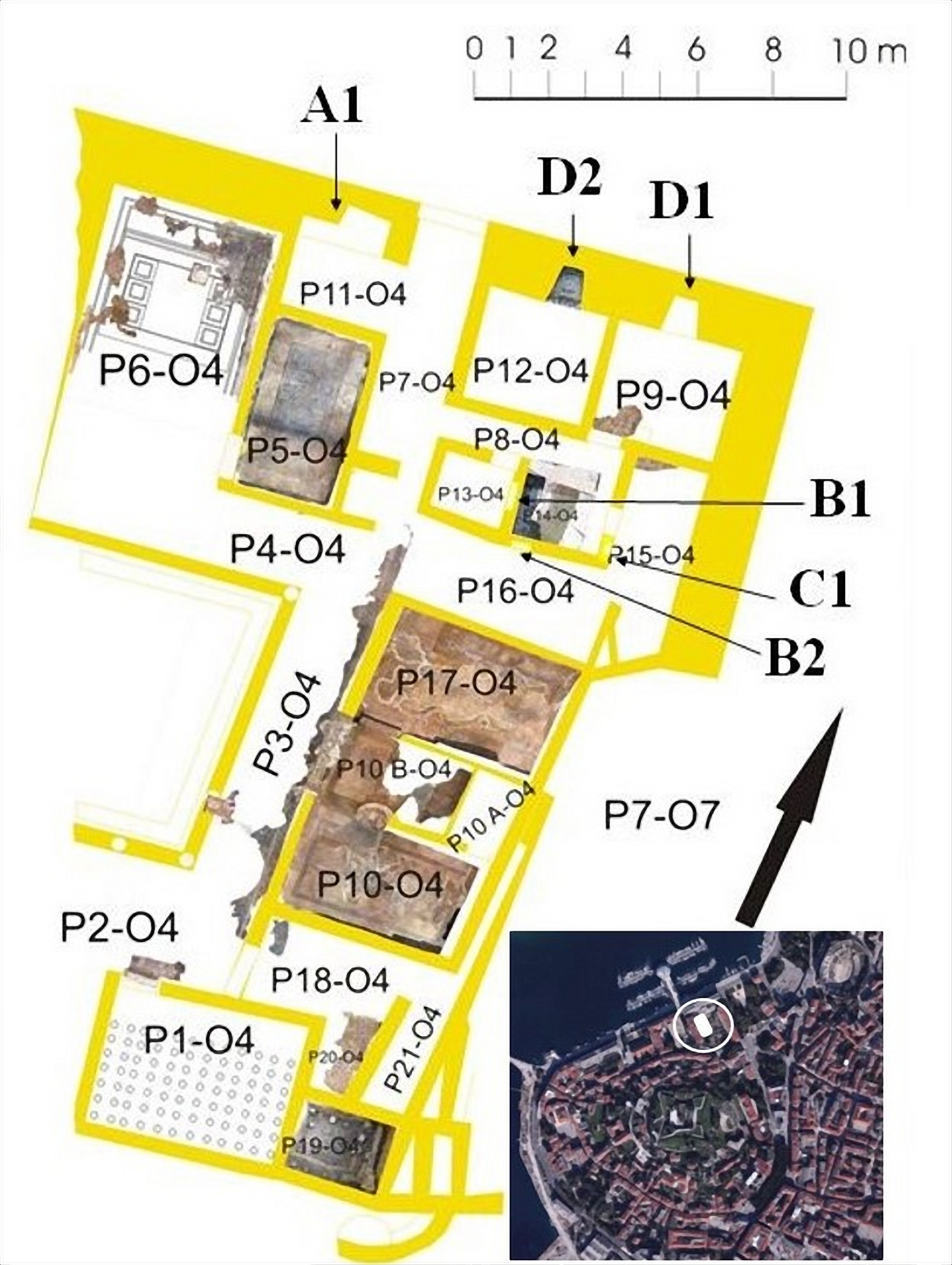 In the quarter of St. Theodore in Pula, next to the public thermae and Hercules' sanctuary, in 2005, most part of the luxurious domus was excavated. The domus was inhabited from the third quarter of the 1st century BC to the 5th century AD, with one major restoration after the fire in the beginning of the 2nd century AD. Architectonic cult indicators are a threshold mosaic with Dionysian motifs of kantharos and wine, niches in the walls and elements of marble architectural decoration of cult spaces, a capital and an architrave. A total of six niches were discovered, one with a white and black mosaic depicting a shell, an altar and containing a dedication to the goddess of Salus. Small finds are represented by various objects used in rituals or objects symbolizing the divine presence. Fragments of the censer with letter-shaped openings, fragments of a large calcite alabaster crater, a clay vessel fragment with a theatrical mask in relief, clay lamps with figures of Minerva and Medusa were found in the triclinium. The finds of Corinthian drinking cups decorated with Dionysian scenes come from other rooms, and from the drainage channel comes a bronze medallion with the Medusa head probably belonging to a carriage. The findings from the domus confirm the presence of cults in every aspect of everyday life. A peculiar niche dedicated to Salus is associated with the neighbouring public thermae and the sanctuary of Hercules built at the sacred spring.Downloads